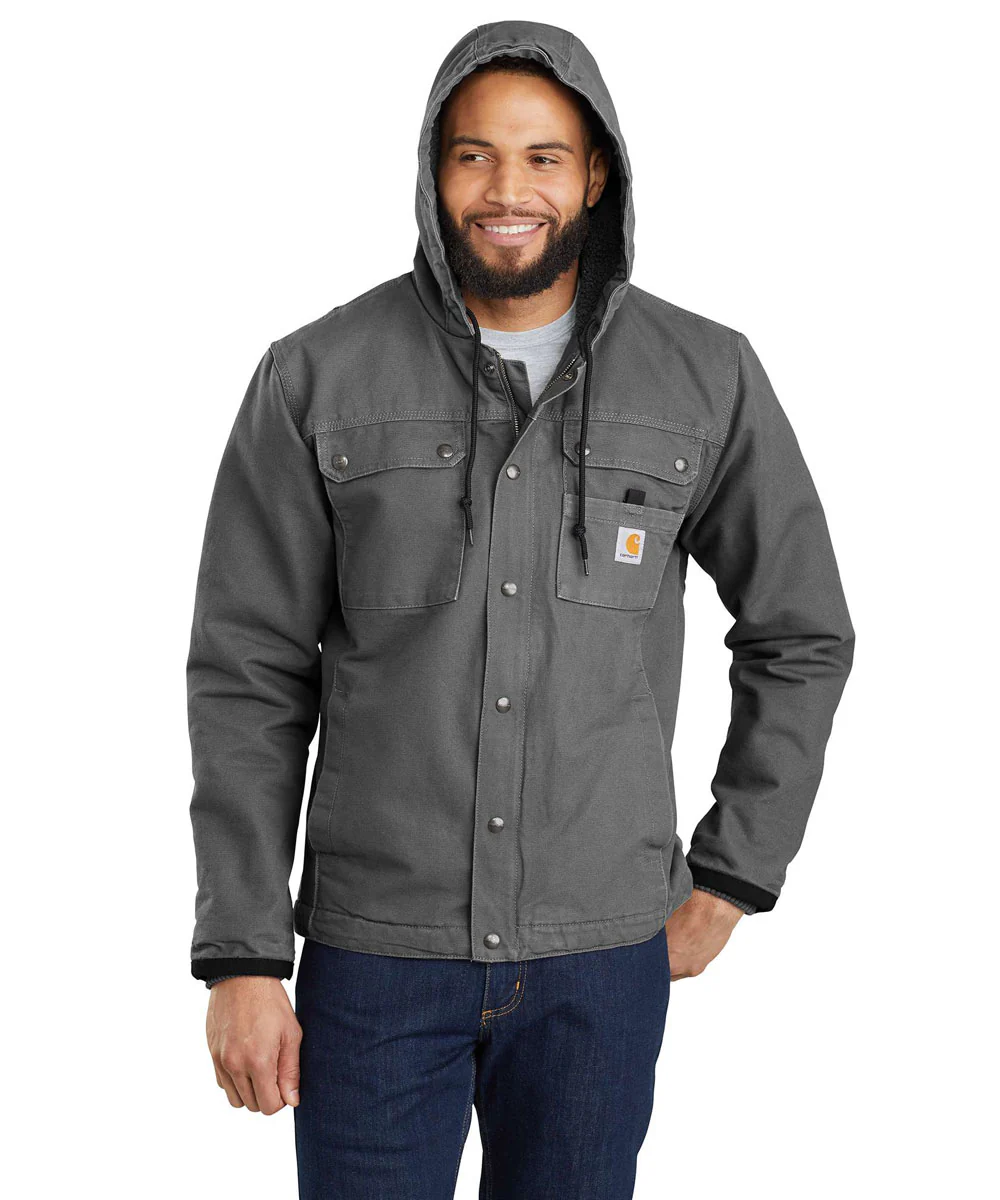 Carhartt's classic and durable canvas in a rinsed fabrication for softness, combined with sherpa lining for warmth, a hood for protection, tons of pockets and other features to keep you working and comfortable all day, regardless of the weather.